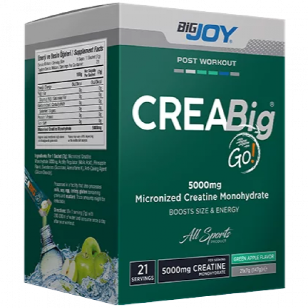 BIGJOY Creabig GO tekli paketlerde ve toz formdadır ve aroma içermez. 1 kutuda 21 paket vardır. Her pakette 5 gram kreatin içerir.