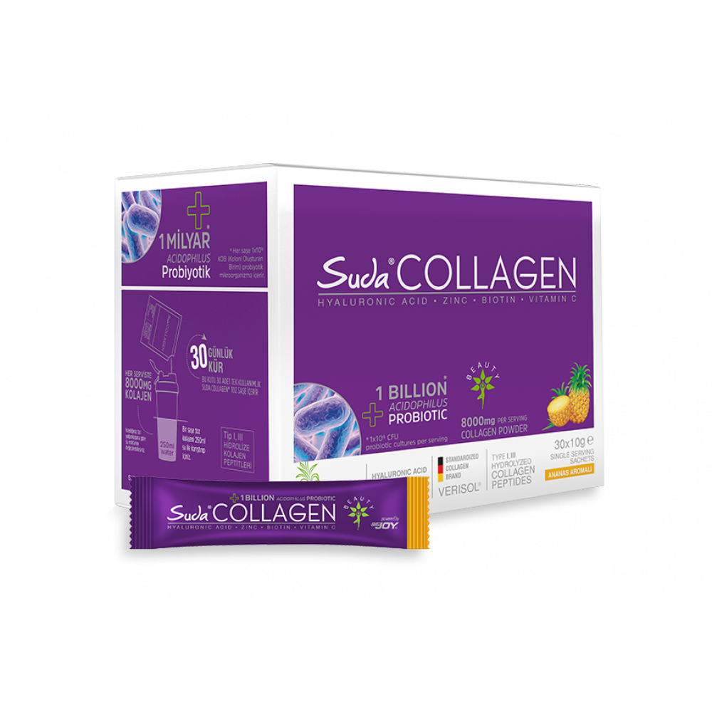 - Suda Collagen®’in toz saşe formu, 1 servisinde 8000 mg hidrolize kolajen peptit içerir.
